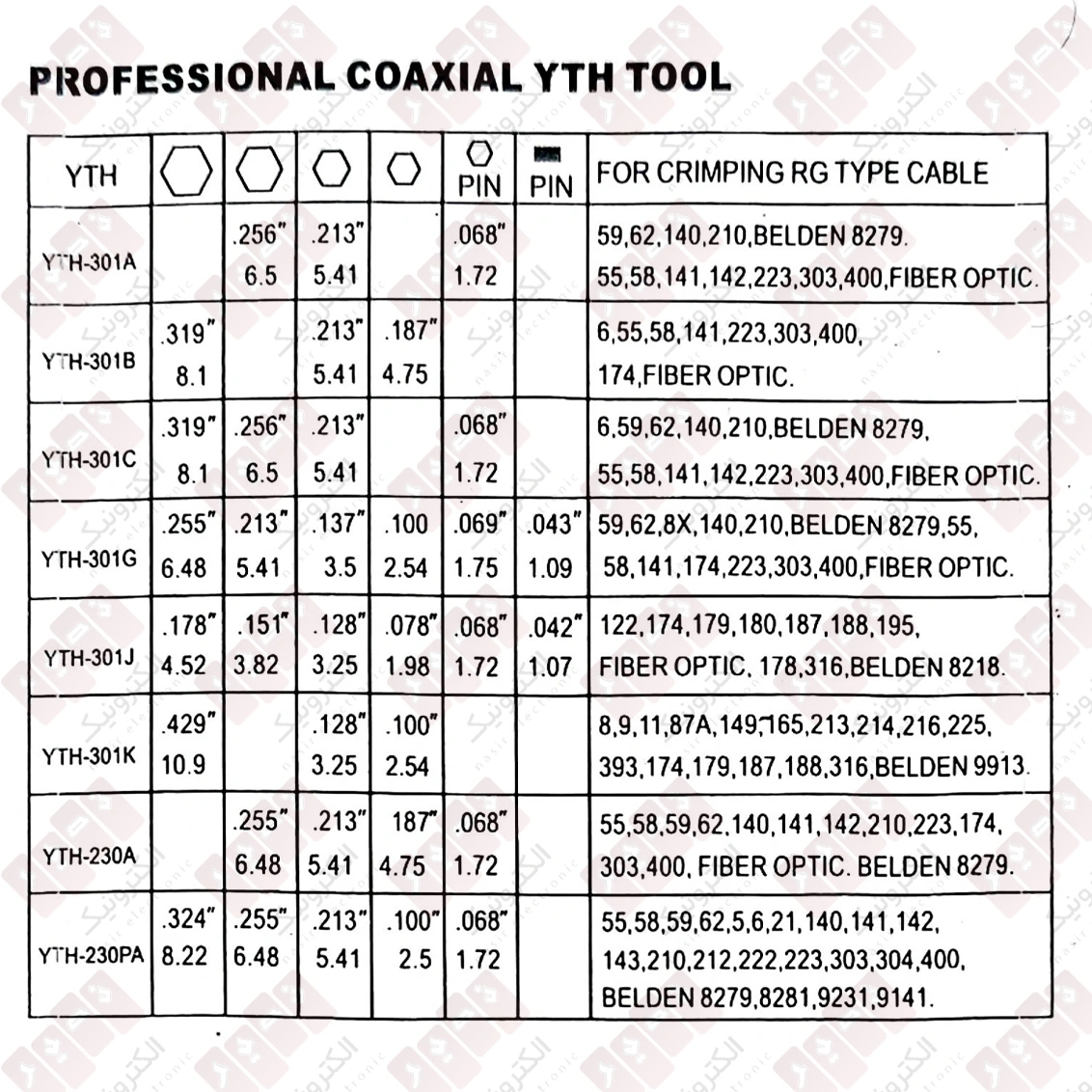 YTH-301C یک ابزار حرفهای است که از فولاد کربنی مقاوم ساخته شده و دستههای ضدلغزش و خوشدست دارد. قالبهای ششضلعی (Hex Crimp) در سایزهای 8.1، 6.5، 5.41 و 1.72 میلیمتر باعث میشوند فشار پرس روی کانکتور یکنواخت پخش شود و کابل یا کانکتور آسیب نبیند.