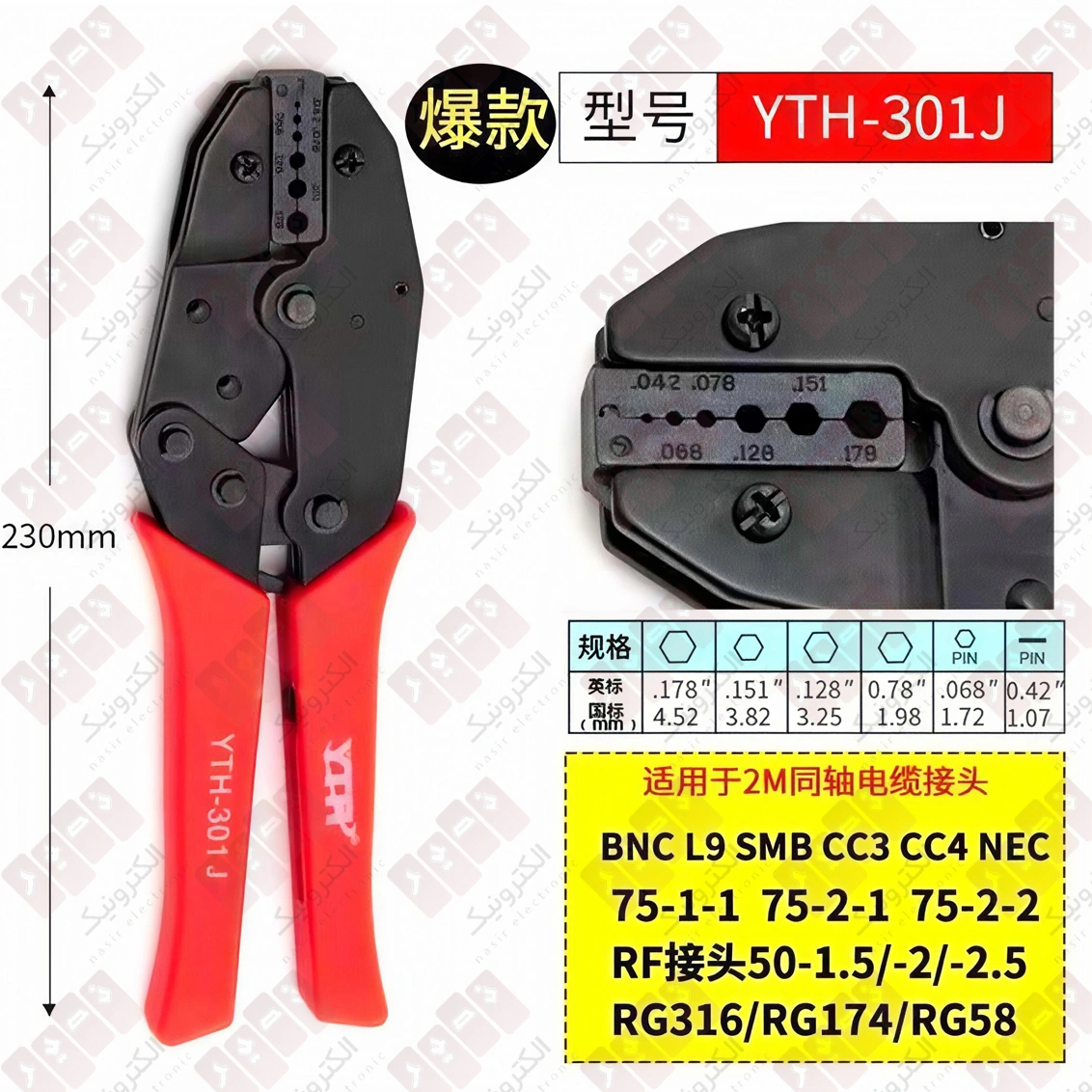 آچار پرس BNC مدل YTH-301J یک ابزار تخصصی برای نصب و پرس کردن کانکتورهای کواکسیال RF مانند BNC در سیستم‌های مخابراتی، دوربین مداربسته و تجهیزات رادیویی است. این آچار پرس کواکسیال برای ایجاد اتصال محکم، دقیق و استاندارد بین کابل و کانکتور طراحی شده و در پروژه‌های RF سبک تا متوسط کاربرد گسترده‌ای دارد.