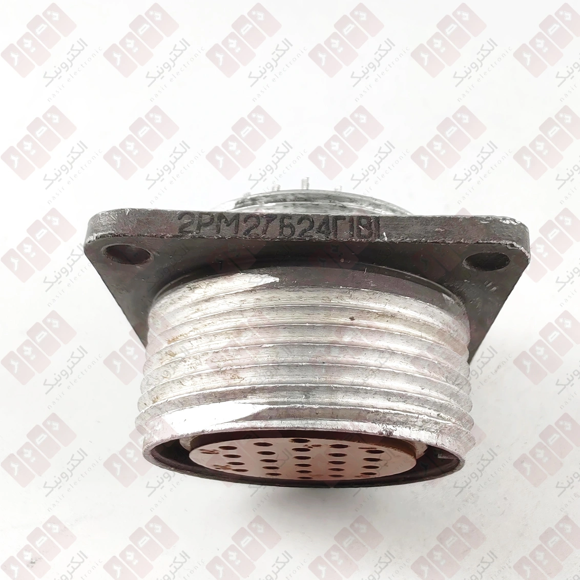 کانکتور24 پین قطر 27 فلنچ ماده  مدل 2PM27Б24Г1В1 ازسری صنعتی 2PMT، یکی از کانکتورهای پرکاربرد در تجهیزات صنعتی، نظامی و کنترلی است. این کانکتور با بدنه‌ی آلومینیومی مقاوم، طراحی فلنچ دار و اتصال پیچی، پایداری بالایی در برابر لرزش، ضربه و شرایط محیطی سخت دارد.  و این مدل دارای 24 پین مادگی با آرایش استاندارد بوده و برای انتقال سیگنال و تغذیه در سیستم‌های صنعتی، مخابراتی و ابزار دقیق استفاده می‌شود. . طراحی دقیق پین‌ها و سیستم کدگذاری استاندارد، این کانکتور را به گزینه‌ای قابل اعتماد برای کاربردهای حرفه‌ای تبدیل کرده است و به دلیل مقاومت بالا،این محصول در تجهیزات الکترونیکی و تجهیزات مخابراتی و رادیویی و صنایع کاربرد دارد و  استفاده می‌شود.جنس بدنه این کانکتور  آلیاژ آلومینیوم سبک با روکش ضد زنگ  است  این کانکتور درجه حفاظتIP67 (ضد آب و گرد و غبار) دارد. محدوده دمای کاری این کانکتور  -60 تا +125 درجه سانتی‌گراد است.این کانکتور به صورت پیچی متصل میشود