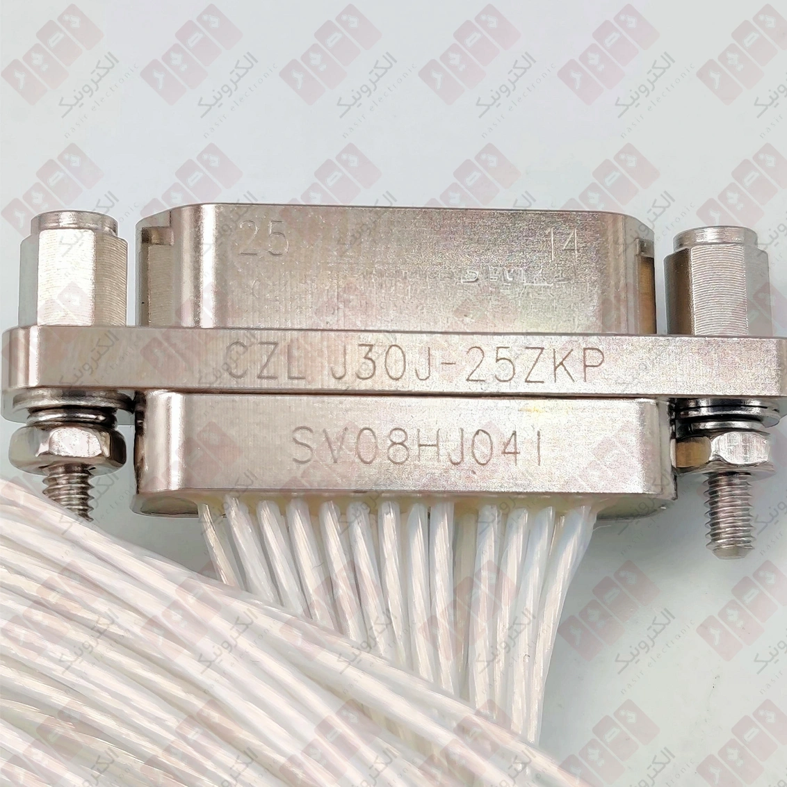 کانکتور J30J-25ZKP-60 بیست وپنج عدد پین مادگی دارد و توسط دو پیچ کناری به کانکتور مقابل خود وصل می شود که احتمال جدا شدن آن در شرایط جوی دشوار را به حداقل می رساند . از ویژگی های این کانکتور می توان به مقاومت بالای آن در برابر دما و ارتعاشات و همچنین نصب آسان آن اشاره کرد . سیم نسوز متصل شده به این کانکتور به نام AFR250 می باشد و شامل سی رشته نقره اندود با روکش تفلن می باشد. طول سیم این کانکتور 60 سانتی متر می باشد و ماکزیمم جریان نامی این کانکتور 3 آمپر است. ایزولاسیون بین پین ها بیش از 5000 مگا اهم می باشد و ولتاژ شکست بین پین ها 800 ولت است. در ادامه تصویری گذاشته شده است که اطلاعات پارت نامبر این نوع از محصولات را بیان می کند :
